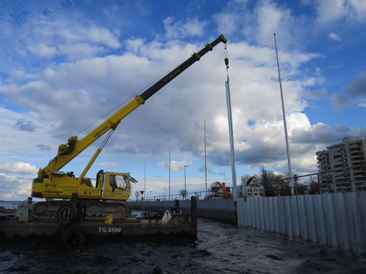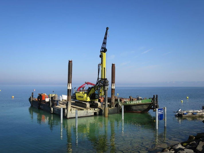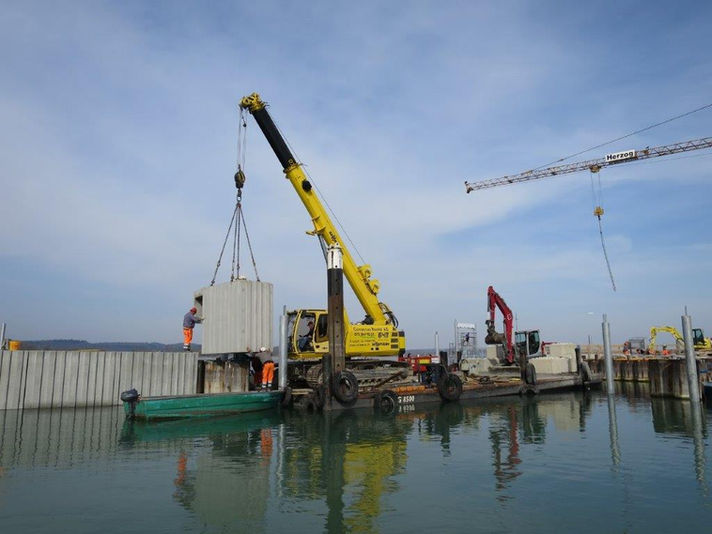 Seit mehr als hundert Jahren gibt es die Firma E. Müller & Co AG. Solange betreiben wir auch die Sparte Wasserbau. In eigener Regie, mit Partnerfirmen, oder als Subunternehmer sind wir rund um den See mit unseren schwimmenden Einheiten tätig. Seien es Sedimentbaggerungen, Rammarbeiten, Materialtransporte, Feuerwerkschiffe oder sonstige Spezialarbeiten auf dem Wasser. Mit unserer langjährigen Erfahrung sind wir gerne Ihr Partner.